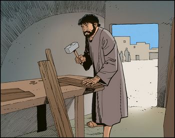 Le charpentier de Nazareth, en transformant des troncs d'arbre en charpentes ou en mobiliers, nous donne l'exemple type du règne de l'homme sur la création. On ne trouve pas, dans le monde créé, des charpentes toutes faites, pour ne citer que cela. Mais la soumission intelligente et mesurée de ce que la nature nous offre (les arbres que l'on abat et les jeunes pousses que l'on replante ensuite pour remplacer les arbres abattus) fait participer le travail humain à la création. Nous ne prenons pas toujours conscience de la dignité du travail humain, de son importance dans sa participation à la création. La liturgie proclame pourtant cette dignité : « Dieu, tu as fait l'homme à ton image et Tu lui as confié l'univers, afin qu'en Te servant, Toi, son Créateur, il règne sur la création * Prière eucharistique IV. » Cette dignité du travail humain ressort aussi lumineusement dans le rite de préparation des dons : « Tu es béni, Dieu de l'univers, toi qui nous donnes ce pain, fruit de la terre et du travail des hommes, [...] toi qui nous donnes ce vin, fruit de la vigne et du travail des hommes...